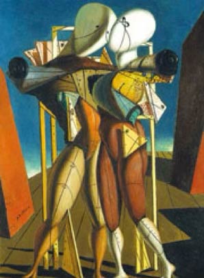 Ora, a dimostrazione di quanto detto, osserviamo attentamente un’immagine stranissima, quella di due manichini, che Giorgio De Chirico, importante pittore metafisico, ha posto uno di fronte all’altro e ha intitolato il quadro: Ettore e Andromaca.
